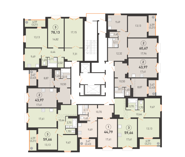 В 15-этажном доме запроектированы 104 квартиры: от однокомнатных до трехкомнатных площадью от 44 до 78 «квадратов». Предусмотрены как классические планировки, так и квартиры евроформата. Есть квартиры с отделкой: на первом, втором и четвертом в предчистовом формате White Box с готовым санузлом, а на третьем — с готовой отделкой «Basic».